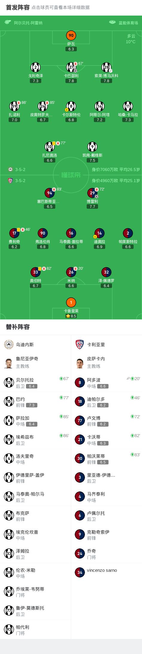 乌迪内斯1-1卡利亚里,博雷利破门,卡巴瑟利救主